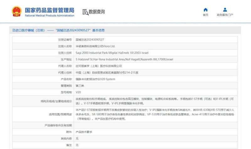 近日,國家藥監局發布公告稱,2024年9月,國家藥監局共批準注冊醫療器械產品444個。在批準注冊的產品清單附件中,有一款進口第三類醫療器械引起了我們的注意——強脈沖光射頻治療儀。我們通過檢索附件中公布的注冊證編號發現,該產品的注冊人是以色列華諾美容科技有限公司Viora Ltd.,國內代理人則是華東醫藥的子公司欣可麗美學(上海)醫療科技有限公司。