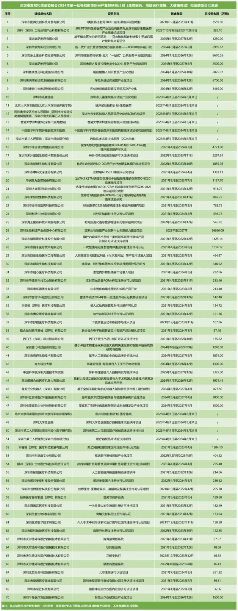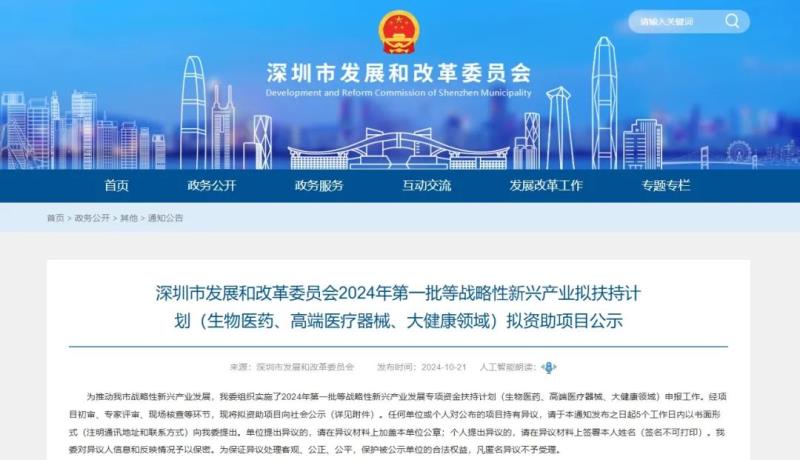 10月21日,深圳市發(fā)展和改革委員會發(fā)布了2024年第一批戰(zhàn)略性新興產(chǎn)業(yè)扶持計劃(生物醫(yī)藥、高端醫(yī)療器械、大健康領(lǐng)域)擬資助項(xiàng)目,公示時間為5個工作日。我們通過查閱附件表格后發(fā)現(xiàn),本批共有70個擬資助項(xiàng)目,包括醫(yī)藥領(lǐng)域臨床前研究、臨床試驗(yàn)扶持、注冊許可扶持等,總投資金額最高的為96666萬元。深圳發(fā)改委將根據(jù)此前公布的相應(yīng)領(lǐng)域的專項(xiàng)資金項(xiàng)目申報指南,按總投資金額的一定比例對企業(yè)進(jìn)行補(bǔ)貼。