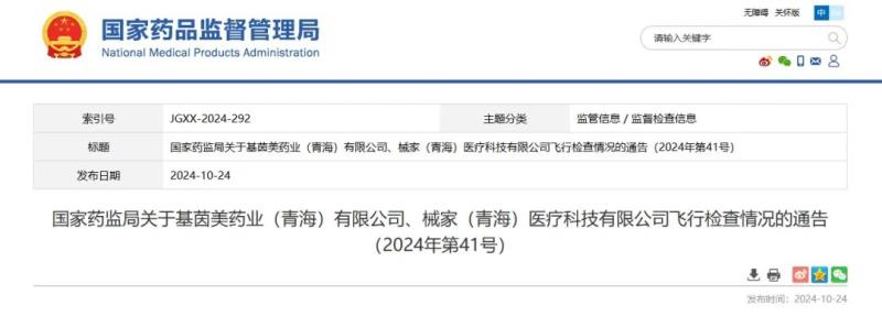 10月24日,國家藥監局發布通告稱,該局組織檢查組隊醫療器械注冊人**藥業(青海)有限公司及其受托生產企業**(青海)醫療科技有限公司進行飛行檢查,發現兩家企業的質量管理體系存在嚴重缺陷。具體如下: