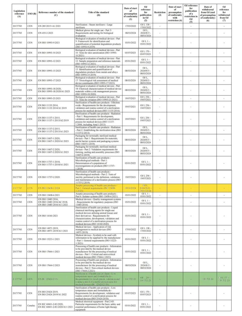 截至目前,歐盟MDR協(xié)調標準清單共計26項協(xié)調標準,具體見下方圖片(其中標黃的為本次更新標準,標綠的則為已經(jīng)撤銷的標準):