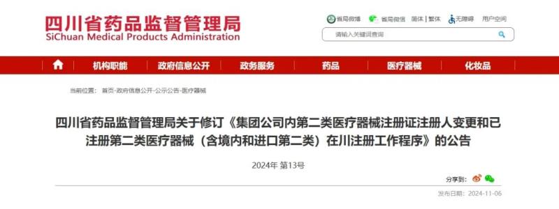 近日,四川省藥監局發布了新版《集團公司內第二類醫療器械注冊證注冊人變更和已注冊第二類醫療器械(含境內和進口第二類)在川注冊工作程序》,具體內容如下: