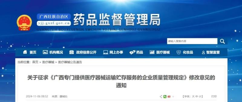 近日,廣西壯族自治區藥監局發布《廣西專門提供醫療器械運輸貯存服務的企業質量管理規定》(以下簡稱《規定》),并向社會公開征求意見。