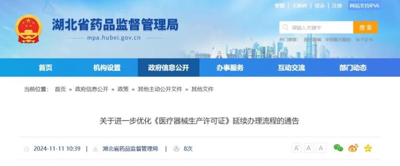 11月11日,湖北省藥監局發布《關于進一步優化〈醫療器械生產許可證〉延續辦理流程的通告》(以下簡稱《通告》),具體內容如下:
