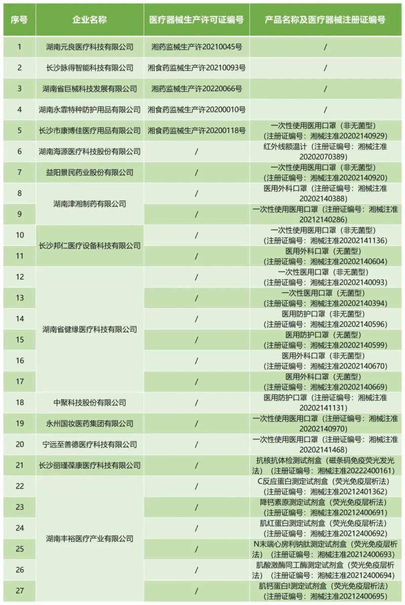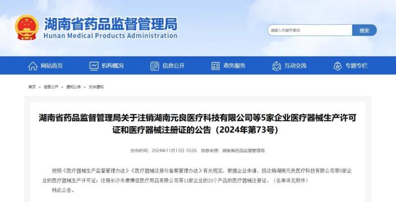 11月13日,湖南省藥監(jiān)局發(fā)布公告稱,按照《醫(yī)療器械監(jiān)督管理條例》《醫(yī)療器械生產(chǎn)監(jiān)督管理辦法》有關(guān)規(guī)定,根據(jù)企業(yè)申請,現(xiàn)注銷湖南元良醫(yī)療科技有限公司等5家企業(yè)的醫(yī)療器械生產(chǎn)許可證;注銷長沙市康博佳醫(yī)療用品有限公司、湖南省健緣醫(yī)療科技有限公司等11家企業(yè)的23個產(chǎn)品(以醫(yī)用口罩居多)的醫(yī)療器械注冊證,具體明細(xì)如下: