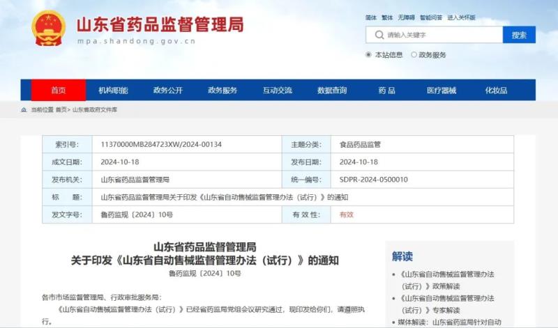日前,山東省藥監局發布《山東省自動售械監督管理辦法(試行)》(以下簡稱《辦法》),并宣布自2024年11月18日起施行。