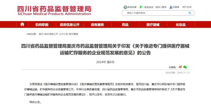 近日,四川省藥監局與重慶市藥監局聯合發布《關于推進專門提供醫療器械運輸貯存服務的企業規范發展的意見》(以下簡稱《意見》),以規范四川省、重慶市行政區域內專門提供醫療器械運輸、貯存服務的企業質量管理工作,引導行業高質量發展。