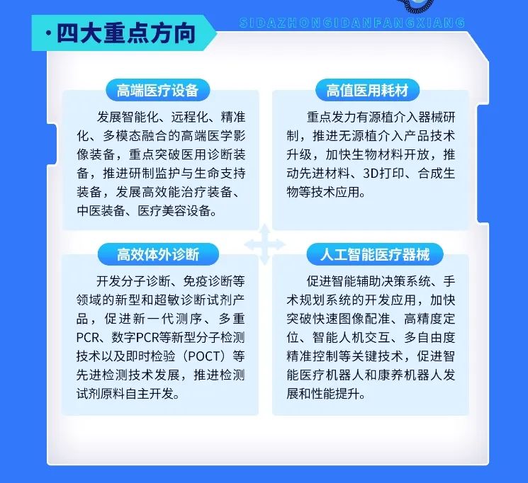 《行動(dòng)計(jì)劃》共提出了四大重點(diǎn)方向、六個(gè)重大工程、八大保障措施,按照“融合創(chuàng)新、醫(yī)產(chǎn)協(xié)同、聯(lián)動(dòng)發(fā)展、開放合作”的基本原則,圍繞產(chǎn)業(yè)規(guī)模、創(chuàng)新效益、企業(yè)實(shí)力、產(chǎn)業(yè)生態(tài)四個(gè)維度,提出到2026年總體規(guī)模突破500億元、打造專業(yè)化產(chǎn)業(yè)園區(qū)5個(gè)以上、創(chuàng)新品種累計(jì)突破100個(gè)、力爭培育億元級新產(chǎn)品10個(gè)以上、新增一批國家級或市級創(chuàng)新載體、支持建設(shè)一批創(chuàng)新醫(yī)療器械示范應(yīng)用中心、培訓(xùn)中心、產(chǎn)教融合基地等具體目標(biāo),力爭到“十五五”末建成對標(biāo)世界一流水平的高端創(chuàng)新醫(yī)療器械產(chǎn)業(yè)集群。