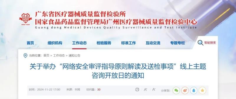 近日,廣東省醫療器械質量監督檢驗所官網發布通知,定于11月27日(周三)舉辦“網絡安全審評指導原則解讀及送檢事項”線上主題咨詢開放日活動,具體時間及參會方式如下: