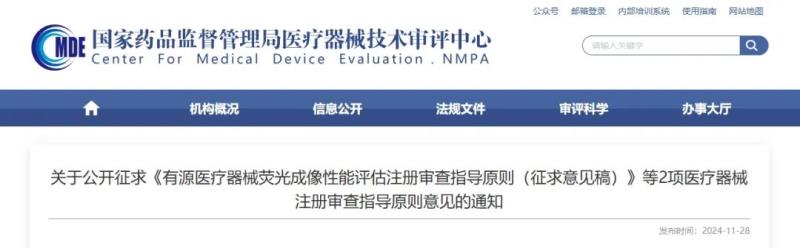 11月28日,國家藥監(jiān)局器審中心發(fā)布《有源醫(yī)療器械熒光成像性能評估注冊審查指導原則(征求意見稿)》《二氧化碳激光治療設備注冊審查指導原則(征求意見稿)》等2項指導原則,并向社會公開征求意見。