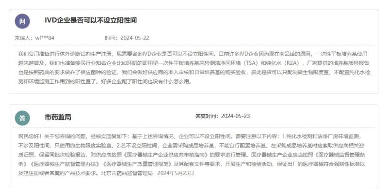 根據北京市藥監局的答復,此情形下企業可以不設立陽性間。需要注意以下內容:1.純化水檢測和潔凈廠房環境監測,不涉及陽性間,只使用微生物限度實驗室。2.若不設立陽性間,企業需采購成品培養基,不能自行配置培養基。在采購成品培養基時應索取供應商相關資質證照,保留同批次檢驗報告,對供應商按照《醫療器械生產企業供應商審核指南》的要求進行管理。醫療器械生產企業應當按照《醫療器械監督管理條例》《醫療器械生產監督管理辦法》《醫療器械生產質量管理規范》及其配套文件等要求,開展生產和檢驗活動,保證出廠的醫療器械符合強制性標準以及經注冊或者備案的產品技術要求。