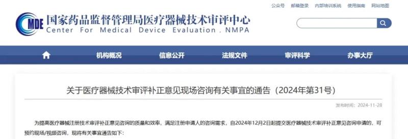 近日,國家藥監局器審中心發布《關于醫療器械技術審評補正意見現場咨詢有關事宜的通告》,其中提到,自2024年12月2日起提交醫療器械技術審評補正意見咨詢申請的,可預約現場/視頻咨詢,有關事宜通告如下: