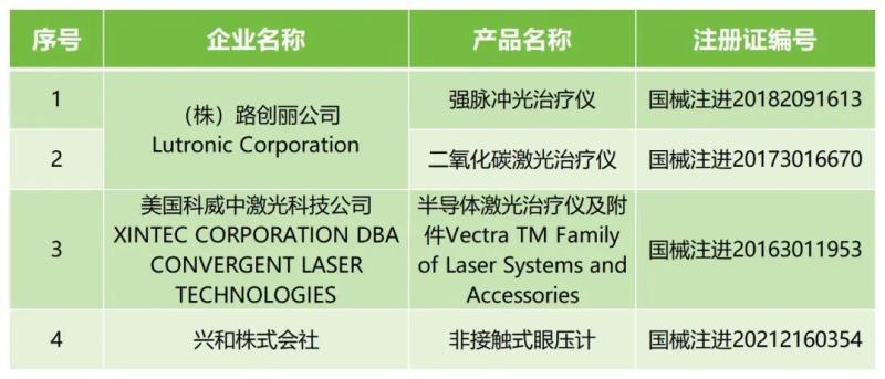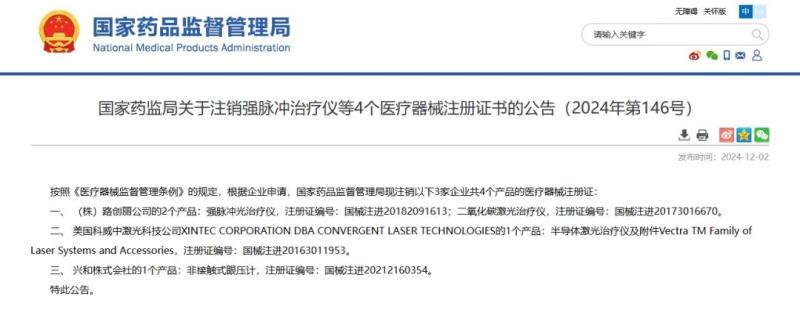 12月2日,國家藥監(jiān)局發(fā)布一則醫(yī)療器械注冊證注銷公告,公告顯示,局已依法注銷(株)路創(chuàng)麗公司Lutronic Corporation、興和株式會社等3家境外企業(yè)共計(jì)4個產(chǎn)品的醫(yī)療器械注冊證,包括強(qiáng)脈沖光治療儀、二氧化碳激光治療儀等,均為進(jìn)口產(chǎn)品,具體明細(xì)如下: