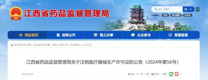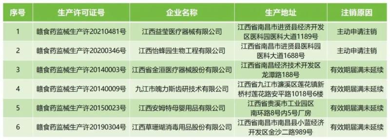 12月3日,江西省藥監局發布公告稱,根據《中華人民共和國行政許可法》《醫療器械監督管理條例》《醫療器械生產監督管理辦法》規定,由于企業主動申請注銷或有效期屆滿未延續,該局已依法注銷江西益瑩醫療器械有限公司、江西怡蜂園生物工程有限公司等6家企業的《醫療器械生產許可證》,具體明細如下: