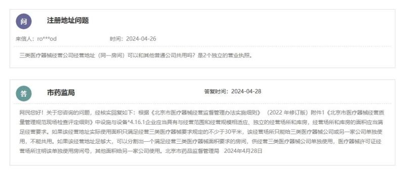 根據北京市藥監局的答復,《北京市醫療器械經營監督管理辦法實施細則》(2022 年修訂版)附件1《北京市醫療器械經營質量管理規范現場檢查評定細則》,其中“設施與設備”章節4.16.1規定:“企業應當具有與經營范圍和經營規模相適應、獨立的經營場所和庫房,經營場所和庫房的面積應當滿足經營要求。”