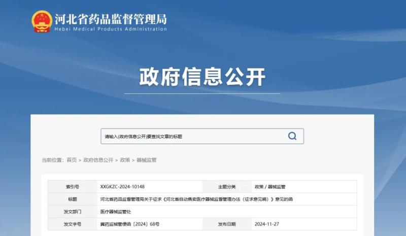 近日,河北省藥監局發布《河北省自動售賣醫療器械監督管理辦法(征求意見稿)》(以下簡稱《辦法》),并向社會公開征求意見。