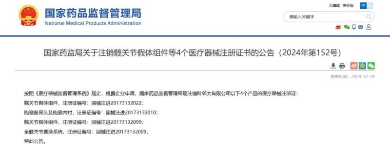 12月19日,國家藥監(jiān)局發(fā)布一則醫(yī)療器械注冊證注銷公告,公告顯示,局已依法注銷科鄰太有限公司4個Ⅲ類產(chǎn)品的醫(yī)療器械注冊證,具體如下: