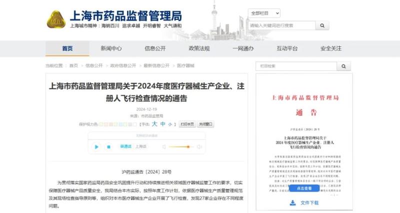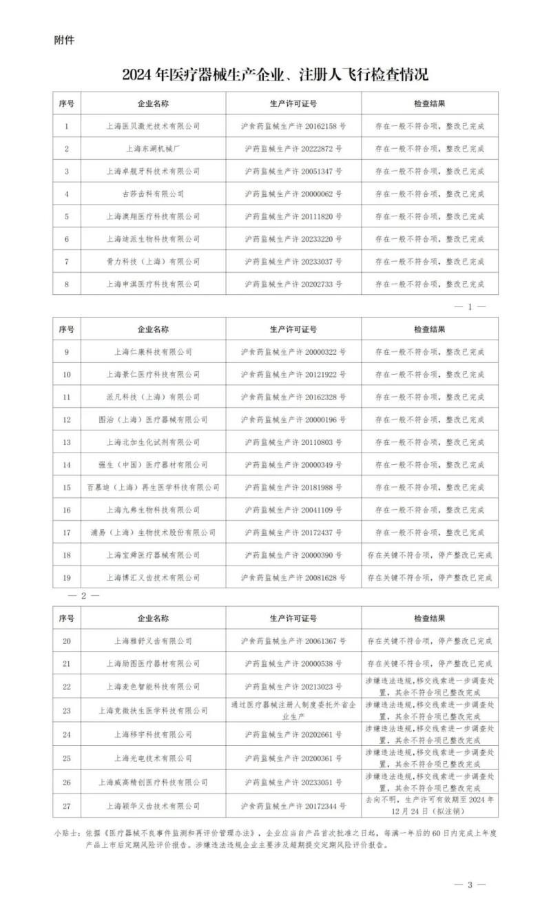 12月19日,上海市藥監(jiān)局發(fā)布《關(guān)于2024年度醫(yī)療器械生產(chǎn)企業(yè)、注冊人飛行檢查情況的通告》,其中提到,依據(jù)醫(yī)療器械生產(chǎn)質(zhì)量管理規(guī)范及其現(xiàn)場檢查指導原則等,該局組織對上海市醫(yī)療器械生產(chǎn)企業(yè)開展了飛行檢查,發(fā)現(xiàn)27家企業(yè)存在不同程度問題,其中17家企業(yè)存在一般不符合項4家企業(yè)存在關(guān)鍵不符合項5家企業(yè)涉嫌違法違規(guī),另有一家企業(yè)去向不明。其中有一點值得注意的是,涉嫌違法違規(guī)企業(yè)主要涉及超期提交定期風險評價報告。本次“飛檢”情況具體明細如下: