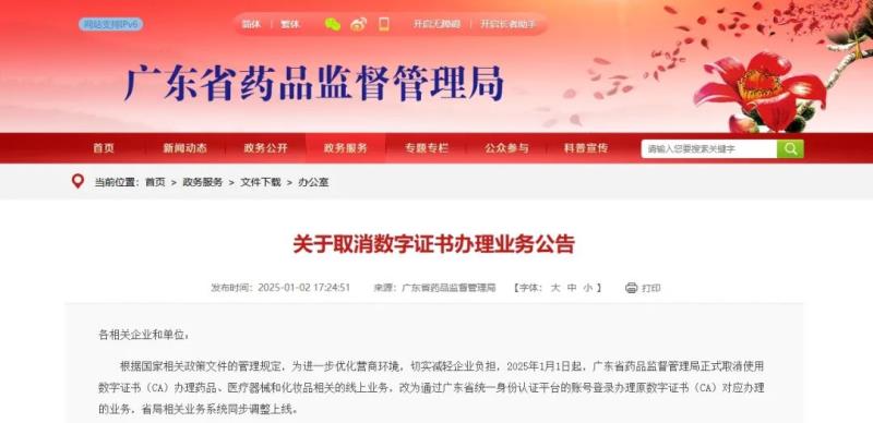 一、廣東省藥監行業企業用戶免費領用的數字證書(含移動數字證書)通道同步關閉,已申領的企業用戶可持續使用至該數字證書有效期結束。 二、原使用數字證書(CA)辦理業務的通道繼續保留至業務辦理完畢,請各相關企業和單位在業務辦理完結后盡快完成切換。 三、在使用過程中有任何疑問和建議,請撥打020-37886123、020-37886352進行咨詢及答疑。