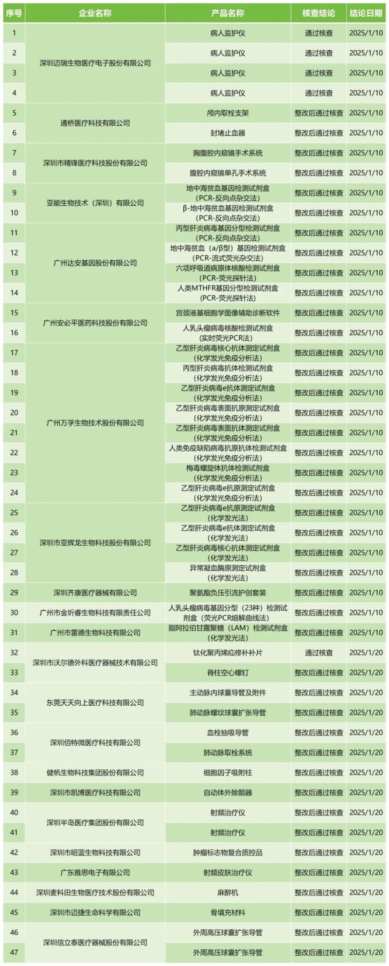 2月12日,廣東省藥監(jiān)局官網(wǎng)公布2025年1月醫(yī)療器械注冊(cè)質(zhì)量管理體系核查結(jié)果,包括深圳邁瑞生物醫(yī)療電子股份有限公司的四款病人監(jiān)護(hù)儀、深圳半島醫(yī)療集團(tuán)股份有限公司的兩款射頻治療儀、廣東雅思電子有限公司的射頻皮膚治療儀等共計(jì)47款產(chǎn)品,其中有五款產(chǎn)品核查結(jié)論為“通過核查”,其余均為“整改后通過核查”。具體明細(xì)見下方表格: