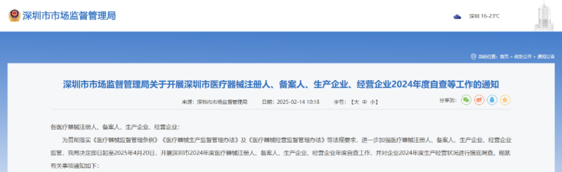 近日,深圳市市場監督管理局發布《關于開展深圳市醫療器械注冊人、備案人、生產企業、經營企業2024年度自查等工作的通知》(以下簡稱《通知》),具體內容如下: