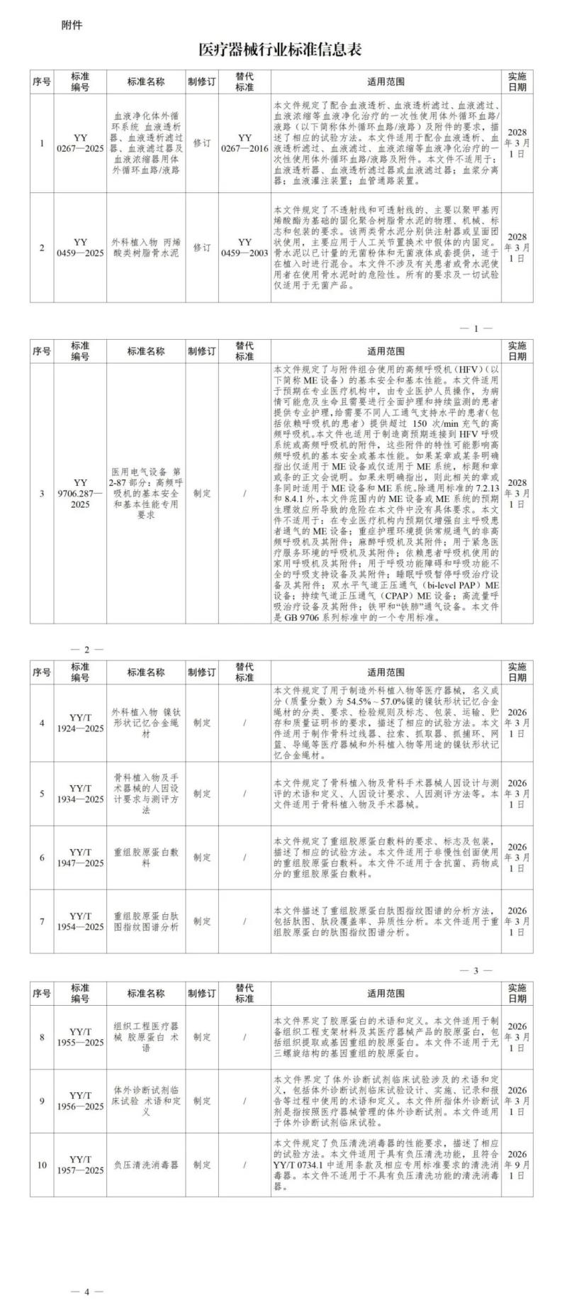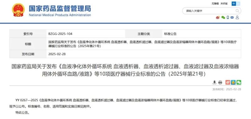 2月28日,國家藥監局發布YY 0267-2025《血液凈化體外循環系統 血液透析器、血液透析濾過器、血液濾過器及血液濃縮器用體外循環血路/液路》、YY 9706.287-2025《醫用電氣設備 第2-87部分:高頻呼吸機的基本安全和基本性能專用要求》、YY/T 1947-2025重組膠原蛋白敷料》等10項醫療器械行業標準,其中2項標準為修訂,8項為制定,最早自2026年3月1日起實施,具體明細如下:
