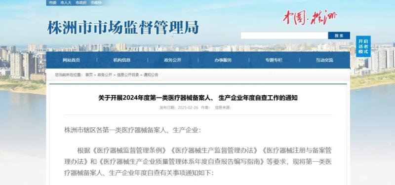 近日,株洲市市場監督管理局發布通知稱,全市范圍內第一類醫療器械備案人、生產企業應當于2025年3月31日前向株洲市市場監督管理局提交自查報告。