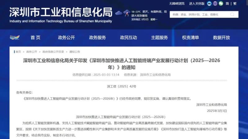 3月3日,深圳市工業和信息化局發布《深圳市加快打造人工智能先鋒城市行動計劃(2025—2026年)》(以下簡稱《行動計劃》),以搶抓人工智能發展新機遇,支持人工智能技術賦能智能終端產品,推動智能終端產業高質量跨越式發展,加快建設國際國內領先的人工智能終端產業集聚區。