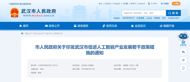 近日,武漢市人民政府發布《武漢市促進人工智能產業發展若干政策措施》(以下簡稱《措施》),以搶抓人工智能發展機遇,加快建設武漢國家人工智能創新應用先導區,打造國內一流的人工智能創新集聚區和產業高地。