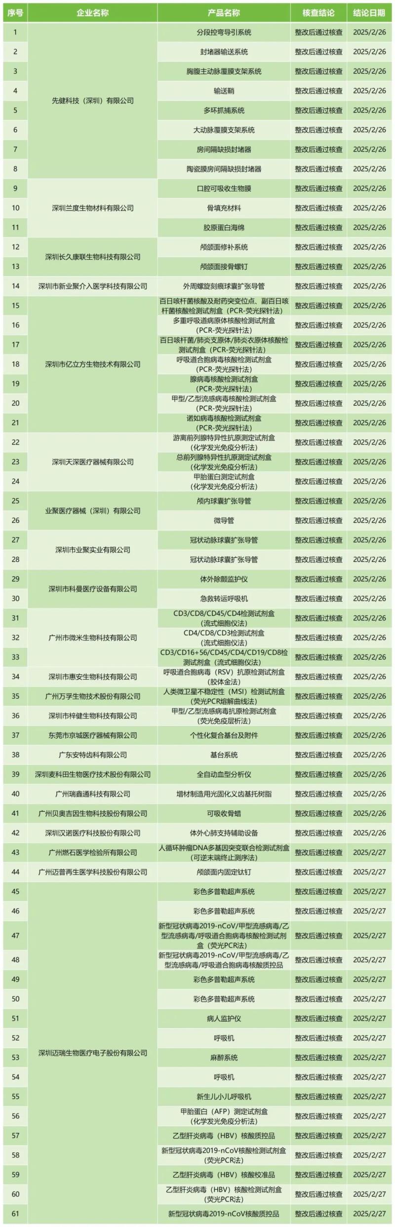 3月13日,廣東省藥監局官網公布2025年2月醫療器械注冊質量管理體系核查結果,包括深圳蘭度生物材料有限公司的膠原蛋白海綿、深圳市科曼醫療設備有限公司的體外除顫監護儀、廣州瑞鑫通科技有限公司的增材制造用光固化義齒基托樹脂、深圳邁瑞生物醫療電子股份有限公司的彩色多普勒超聲系統等共計61款產品,均為“整改后通過核查”。具體明細見下方表格:
