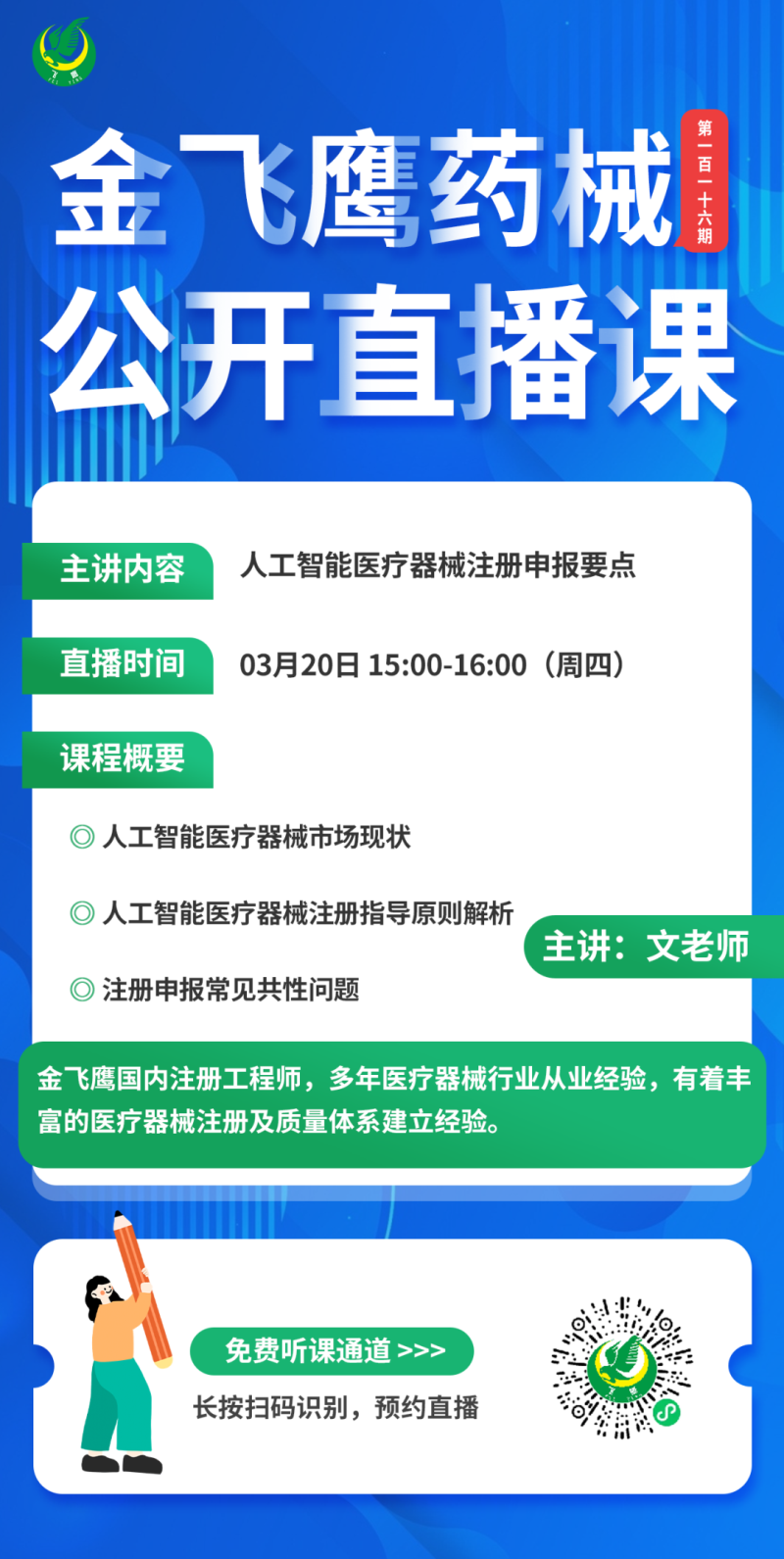 金飛鷹直播培訓簡介 金飛鷹直播培訓,是每周一次的固定培訓欄目,優選金飛鷹國內外資深注冊/項目老師定期為大家講解醫療器械注冊相關知識,解答大家在醫療器械注冊過程中的諸多疑問。 此前我們已為大家帶來新版醫療器械生物學評價標準、新版醫療器械風險管理標準、醫療器械軟件注冊、醫療器械質量管理體系提升技巧等共計115次線上培訓課程,有興趣的可點擊視頻號直播回放進行查看~另外大家也一定很關注接下來的培訓主題,相關培訓預告我們會陸續添加至視頻號,請大家持續關注哦!