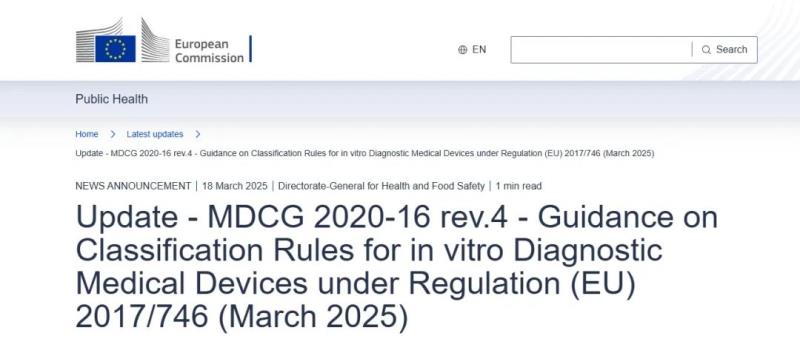 近日,歐盟MDCG小組發布最新指南MDCG 2020-16 Rev.4 -Guidance on Classification Rules for in vitro Diagnostic Medical Devices under Regulation (EU) 2017/746《IVDR法規下體外診斷醫療器械分類規則指南》 ,這是繼2024年7月該指南發布第三版后的再次更新,本次更新共有以下內容: