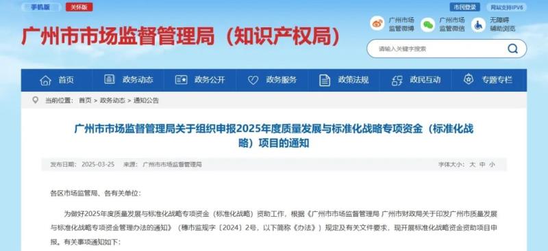 近日,廣州市市場監督管理局發布《關于組織申報2025年度質量發展與標準化戰略專項資金(標準化戰略)項目的通知》(以下簡稱《通知》),共提到了7種項目申報范圍,包括標準制定修訂項目、標準化組織項目、標準化研究項目等,具體事項如下: