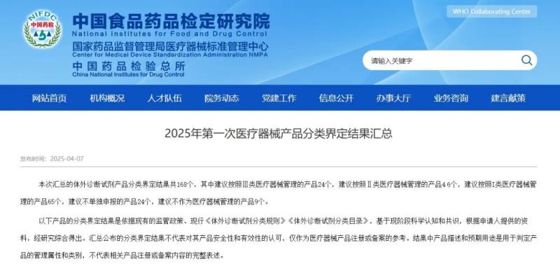 4月7日,國家藥監局醫療器械標準管理中心發布《2025年第一次醫療器械產品分類界定結果匯總》,本次匯總的均為體外診斷試劑產品,共有168個,其中建議按照Ⅲ類醫療器械管理的產品24個,建議按照Ⅱ類醫療器械管理的產品46個,建議按照Ⅰ類醫療器械管理的產品65個,建議不單獨申報的產品24個,建議不作為醫療器械管理的產品9個。