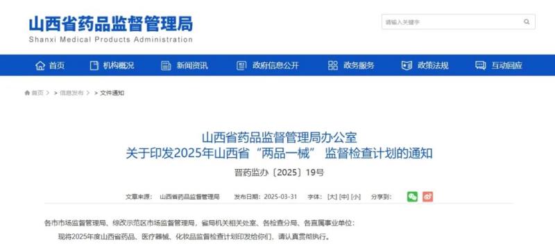 《2025年山西省醫療器械生產企業監督檢查計劃》全文如下: