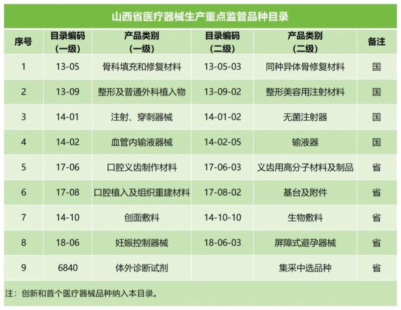 近日,山西省藥監局發布《關于印發2025年山西省“兩品一械” 監督檢查計劃的通知》,共包含《2025年度山西省藥品生產領域監督檢查計劃》《2025年度山西省醫療器械臨床試驗機構監督檢查計劃》《2025年山西省醫療器械生產企業監督檢查計劃》《2025年山西省醫療器械經營使用環節監管工作要點》《2025年度山西省化妝品監督檢查計劃》5個附件,其中《2025年山西省醫療器械生產企業監督檢查計劃》明確了檢查的重點企業、重點產品和重點內容,并以附件形式列出了醫療器械生產9大重點監管品種,還列出了山西省醫療器械生產企業分級監管清單(四級監管30家、三級監管100家、二級監管146家),其中9大重點監管品種具體如下: