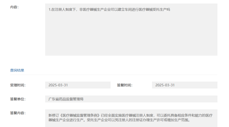 根據(jù)廣東省藥監(jiān)局的答復(fù),新修訂《醫(yī)療器械監(jiān)督管理條例》已經(jīng)全面實施醫(yī)療器械注冊人制度,可以委托具備相應(yīng)條件和能力的醫(yī)療器械生產(chǎn)企業(yè)進行生產(chǎn)。受托生產(chǎn)企業(yè)可以憑注冊人的注冊證辦理生產(chǎn)許可或增加生產(chǎn)范圍。