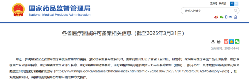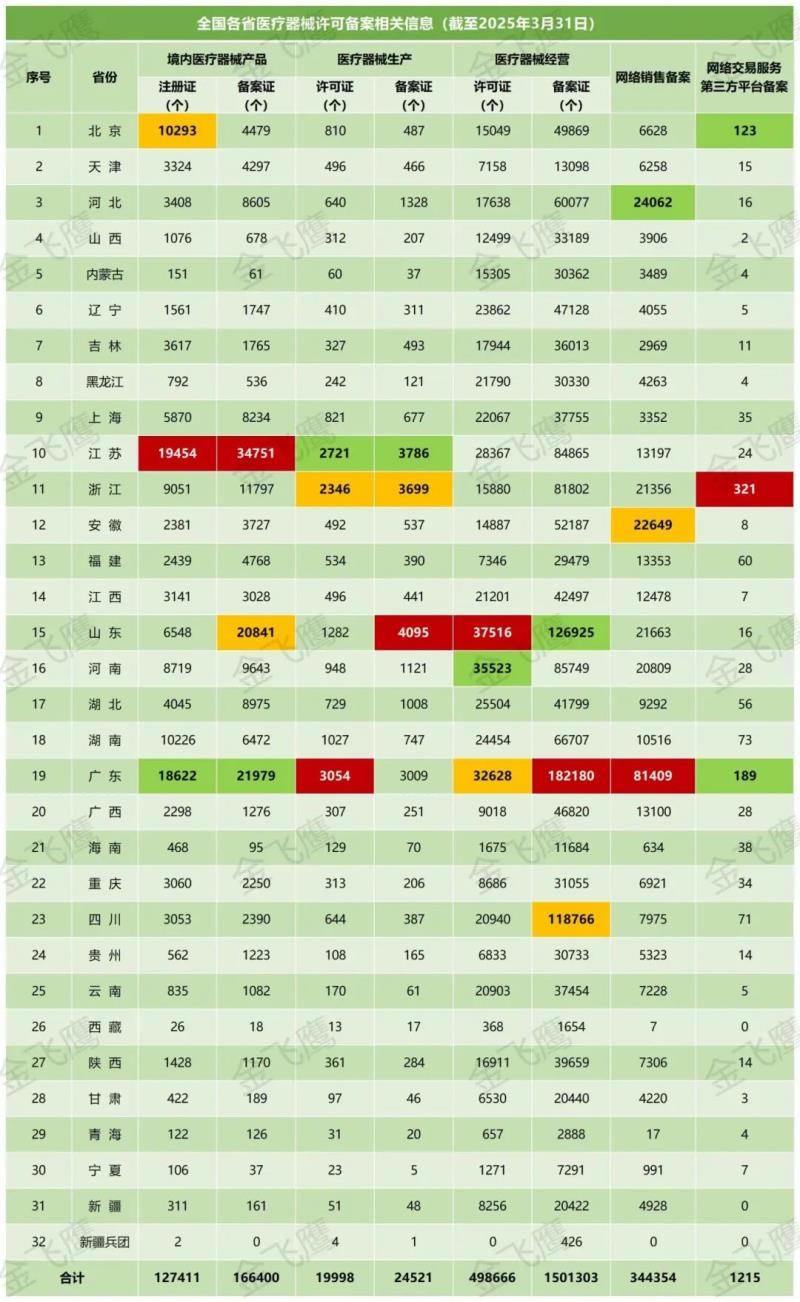 近日,國家藥監局公布了截至2025年3月31日各省有效期內醫療器械產品注冊備案、醫療器械生產企業許可備案等信息,老規矩,金飛鷹小編對此稍作編輯,標注紅色、綠色、黃色的分別為前三甲。