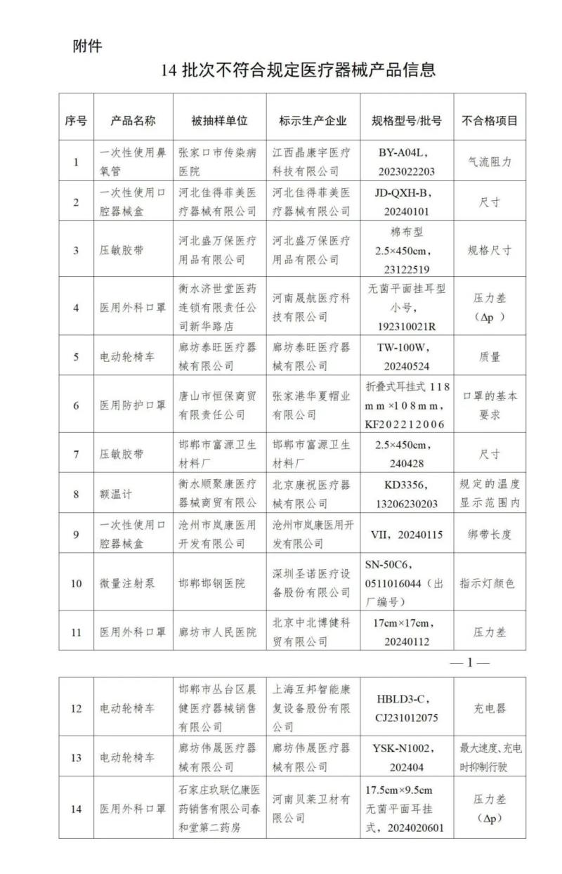 近日,河北省藥監局發布《全省醫療器械監督抽檢結果的公告(2025年第一期)》,其中提到,該局組織對2024年全省生產、經營和使用等環節醫療器械進行了質量監督抽檢,共發現14批次產品不符合標準規定,包括一次性使用鼻氧管、醫用外科口罩、電動輪椅車、微量注射泵等,具體明細如下: