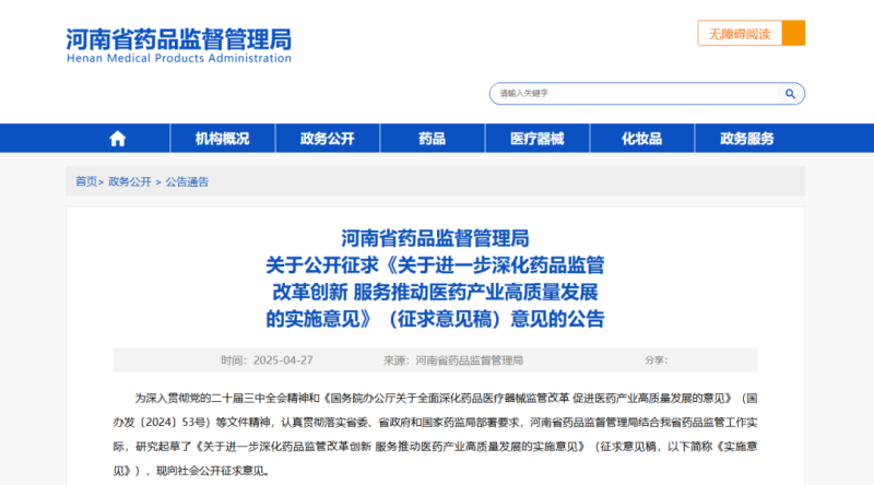 4月27日,河南省藥監局發布《關于進一步深化藥品監管改革創新 服務推動醫藥產業高質量發展的實施意見(征求意見稿)》,以下簡稱《實施意見》),并向社會公開征求意見。