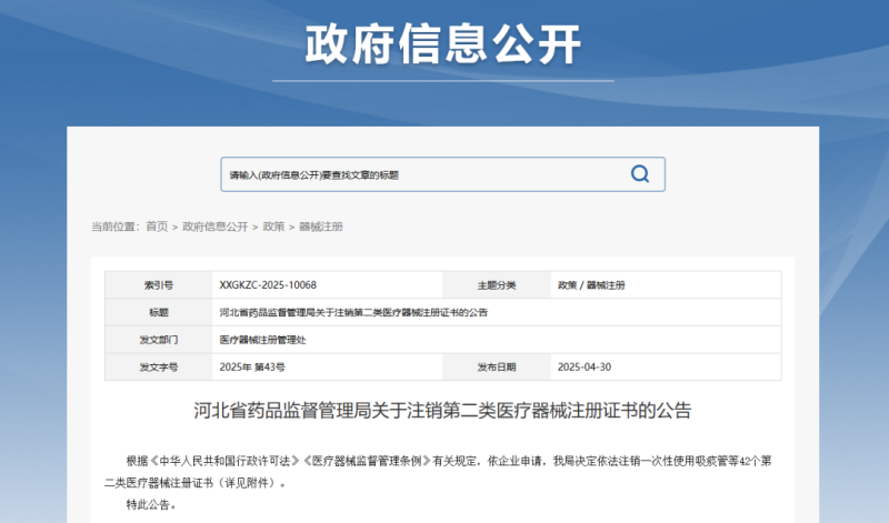近日,河北省藥監(jiān)局發(fā)布公告稱,根據(jù)《中華人民共和國(guó)行政許可法》《醫(yī)療器械監(jiān)督管理?xiàng)l例》有關(guān)規(guī)定,依企業(yè)申請(qǐng),該局依法注銷了42個(gè)第二類醫(yī)療器械注冊(cè)證書,其中有12款產(chǎn)品為醫(yī)用口罩,還有一次性使用吸痰管、一次性使用霧化面罩、一次性使用聚氨酯泡沫敷料、定制式活動(dòng)義齒等,具體明細(xì)如下: