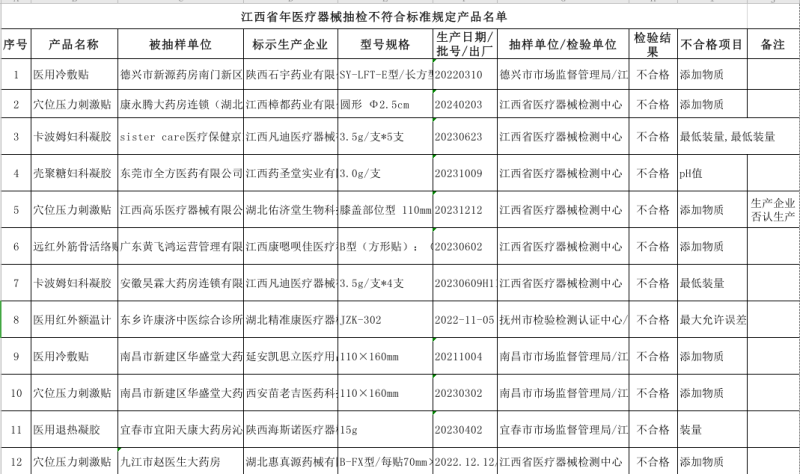 近日,江西省藥監局發布公告稱,該局持續對本省醫療器械生產、經營和使用環節實施了監督抽樣檢驗,共有12批次產品不符合標準規定,涉及醫用冷敷貼、穴位壓力剌激貼、卡波姆婦科凝膠、殼聚糖婦科凝膠等產品,多款產品不合格項目為“添加物質,具體明細如下: