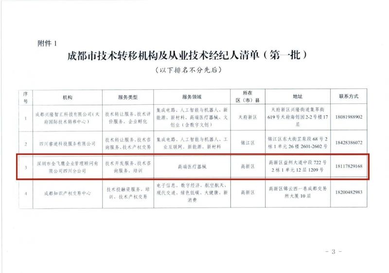 5月7日,成都市技術轉移聯盟通過其官方公眾號正式公布了2025年第一季度成都市技術轉移機構及從業技術經紀人名單。經嚴格評審,深圳市金飛鷹企業管理顧問有限公司四川分公司成功入選20家技術轉移機構之一,服務領域為高端醫療器械。同時,金飛鷹集團創始人車號爽先生及四川分公司總經理陶亞琴女士憑借其豐富的行業經驗和專業能力,則分別當選為從業技術經紀人,為聯盟企業提供咨詢診斷、分析調研、對接撮合等服務。