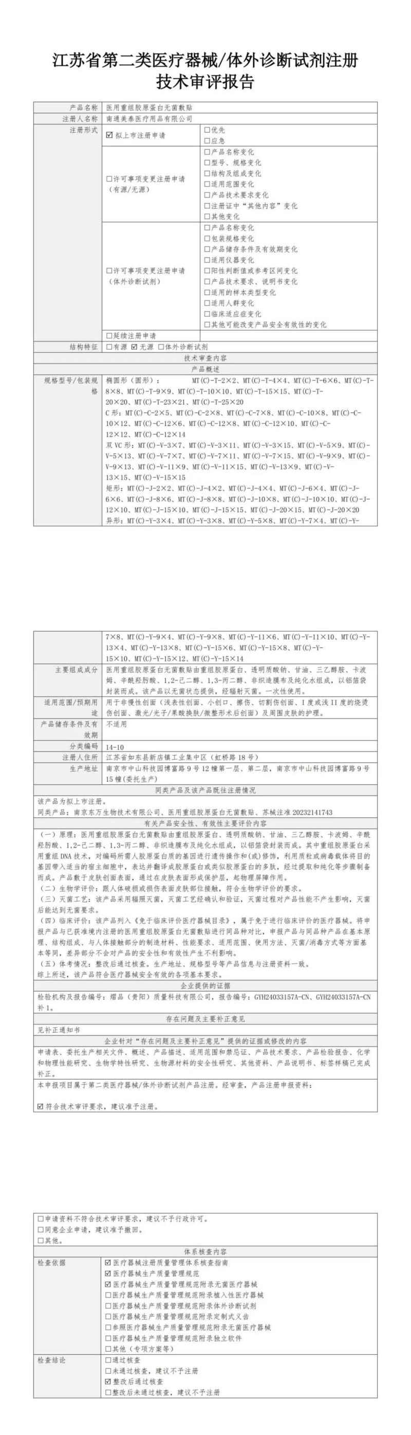 5月12日,江蘇省藥監(jiān)局公布了2025年4月批準注冊的水性聚氨酯避孕套、醫(yī)用透明質酸鈉液體敷料、醫(yī)用重組膠原蛋白液體敷料、低頻治療儀、中頻治療儀、足底壓力步態(tài)評估系統(tǒng)、視頻可視喉鏡、超短波治療儀、增材制造肺部穿刺導板等224個醫(yī)療器械產品目錄,同時隨附了所有產品的技術審評報告,我們其中“醫(yī)用重組膠原蛋白無菌敷貼”[預期用途:用于非慢性創(chuàng)面(淺表性創(chuàng)面、小創(chuàng)口、擦傷、切割傷創(chuàng)面、Ⅰ度或淺Ⅱ度的燒燙傷創(chuàng)面、激光/光子/果酸換膚/微整形術后創(chuàng)面)及周圍皮膚的護理]的技術審評報告以圖片形式轉載如下: