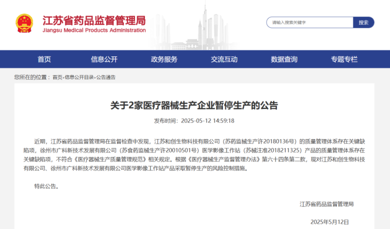 近日,江蘇省藥監局發布公告稱,該局在監督檢查中發現,江蘇**生物科技有限公司(蘇藥監械生產許201801**號)的質量管理體系存在關鍵缺陷項,徐州市**新技術發展有限公司(蘇食藥監械生產許200105**號)醫學影像工作站(蘇械注準20182113**)產品的質量管理體系存在關鍵缺陷項,不符合《醫療器械生產質量管理規范》相關規定。根據《醫療器械生產監督管理辦法》第六十四條第二款,現對江蘇**生物科技有限公司、徐州市**新技術發展有限公司醫學影像工作站產品采取暫停生產的風險控制措施。