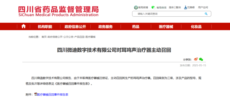近日,四川省藥監局發布一則醫療器械召回公告,其中提到,四川微迪數字技術有限公司報告,由于未取得醫療器械注冊證,主動召回其生產的耳鳴聲治療器。召回級別為三級,涉及產品的型號、規格及批次等詳細信息如下: