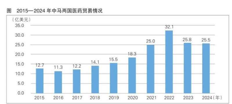 據中國海關統計數據,中馬兩國醫藥貿易額由2015年的12.7億美元,增長至2024年的25.5億美元(詳見下圖),10年間復合增長率為7.22%,總體保持增長態勢。