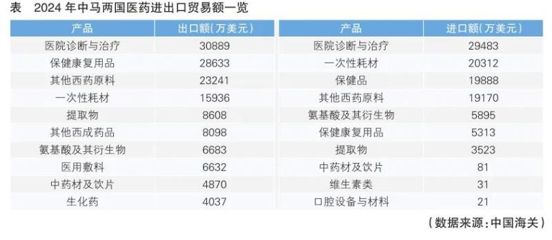 中馬兩國在疫苗、醫院診斷與治療、保健康復等醫藥產品中的合作進一步深化。2024年,醫院診斷與治療產品貿易額較高,約為6.04億美元,其他西藥原料、一次性耗材等產品貿易額均超過1億美元(詳見表)。