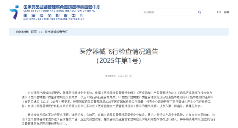 近日,國家藥監(jiān)局食品藥品審核查驗(yàn)中心(以下簡稱“核查中心”)發(fā)布《醫(yī)療器械飛行檢查情況通告(2025年第1號)》,其中提到,核查中心組織開展了醫(yī)療器械生產(chǎn)企業(yè)飛行檢查工作,發(fā)現(xiàn)江蘇百易得醫(yī)療科技有限公司、朔崛(江蘇)醫(yī)療科技有限公司、江西洪達(dá)醫(yī)療器械集團(tuán)有限公司等18家企業(yè)存在不符合《醫(yī)療器械生產(chǎn)質(zhì)量管理規(guī)范》要求的相關(guān)問題,生產(chǎn)品種包括不可吸收帶線錨釘、血液透析濃縮液、髖關(guān)節(jié)假體、醫(yī)用膠原填充劑、注射用交聯(lián)透明質(zhì)酸鈉凝膠等。