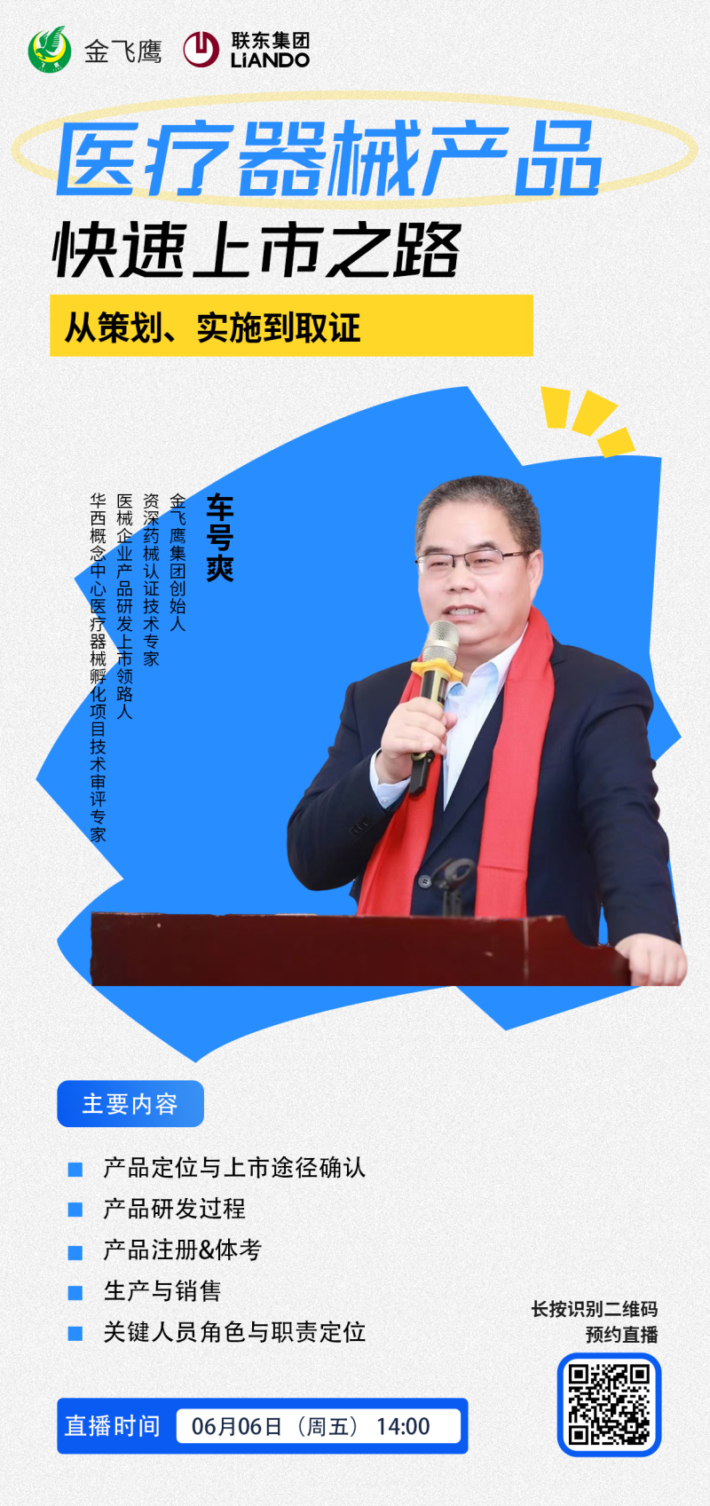 今年4月,金飛鷹與成都聯東U谷聯合主辦了一場線下培訓,得到了園區企業的一致好評。基于前期良好的合作基礎,金飛鷹與聯東U谷產業園區的合作進一步深化升級。6月6日,我們將面向全國聯東U谷產業園區的醫療器械企業,開展“醫療器械產品快速上市之路”線上專題培訓,由集團創始人車號爽老師進行分享,并通過“金飛鷹集團”視頻號同步直播。車老師將結合金飛鷹18年來積累的4000+成功案例,為企業提供可落地執行的實操指導,幫助企業優化注冊申報流程,縮短產品上市周期,提升市場競爭力。
