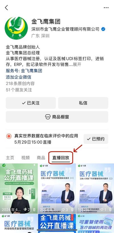 往期直播培訓課程支持回放,關注“金飛鷹藥械咨詢服務”視頻號并點擊視頻號主頁,即可查看“直播回放”哦~